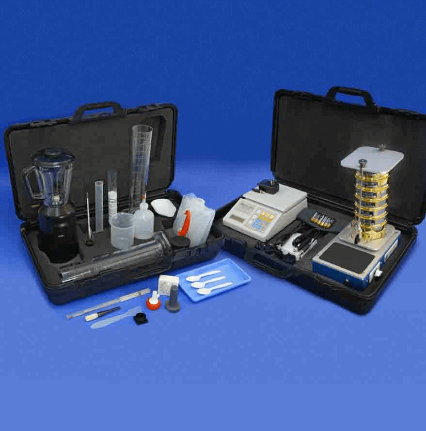 SAN ANDREAS : JUEGO DE ANALISIS / SEPARACION DE SOLIDOS / FINOS TIPO STOKES COMPRENDE: BALANZA DIGITAL, AGITADOR ELECTRICO PORTATIL, JUEGO DE 6 TAMICES, CILINDROS DE SEDIMENTACION, PROBETA, MORTERO y MANO DE MOLIENDA, PLASTICOS, BIDON PLEGLABE DE 2-1/2 GALS., PICETA YORKER; ESPATULA, CUCHARA, BROCHA DE LIMPIEZA, TRITURADORA TIPO LICUADORA, VASO DE PRECIPITADOS, BANDEJAS DE SECADO, TEMPORIZADOR, GUANTES. ESTUCHE DE TRANSPORTACION e INSTRUCTIVO DE MONTAJE / OPERACIÓN.